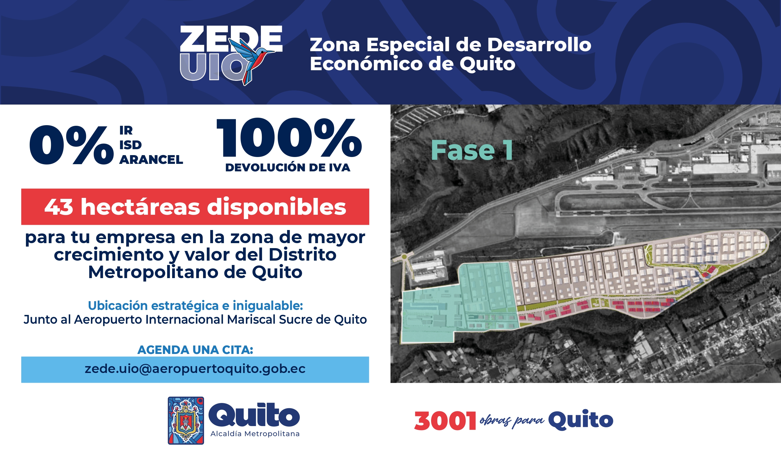 La Zona de Desarrollo Económico de Quito (ZEDE), ubicada junto al Aeropuerto Mariscal Sucre, ofrece un entorno estratégico con 0% en impuesto a la renta, ISD y aranceles, 100% de devolución del IVA y 43 hectáreas disponibles para impulsar la logística, la inversión y el crecimiento empresarial.
