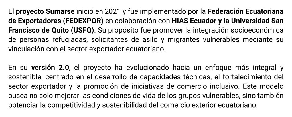 De esta manera, Sumarse 2.0 promueve tanto la competitividad exportadora de las empresas como la generación de nuevas oportunidades de empleo e inclusión en el Ecuador.